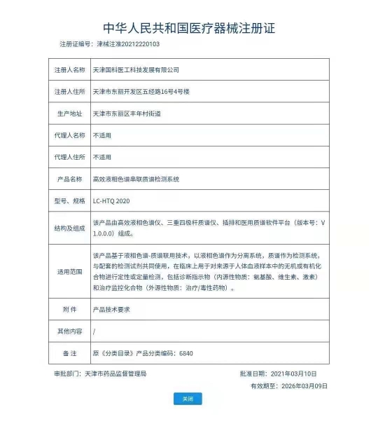天津国科医疗科技发展有限公司“三重四极杆质谱仪”取得医疗器械注册证